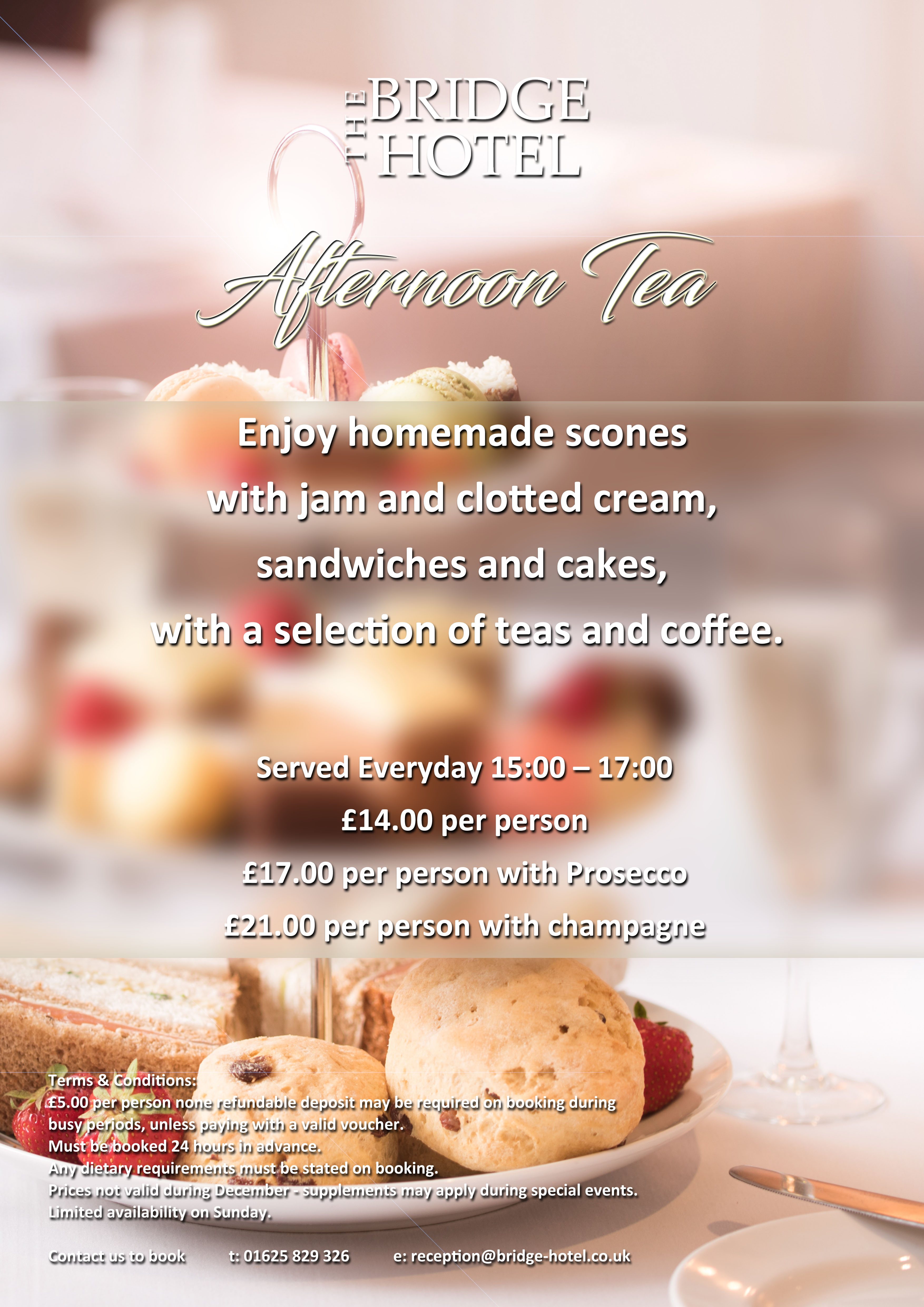 The Bridge Hotel, Prestbury, Cheshire SK10 4DQ T: +44 01625 829326 e: [email protected]