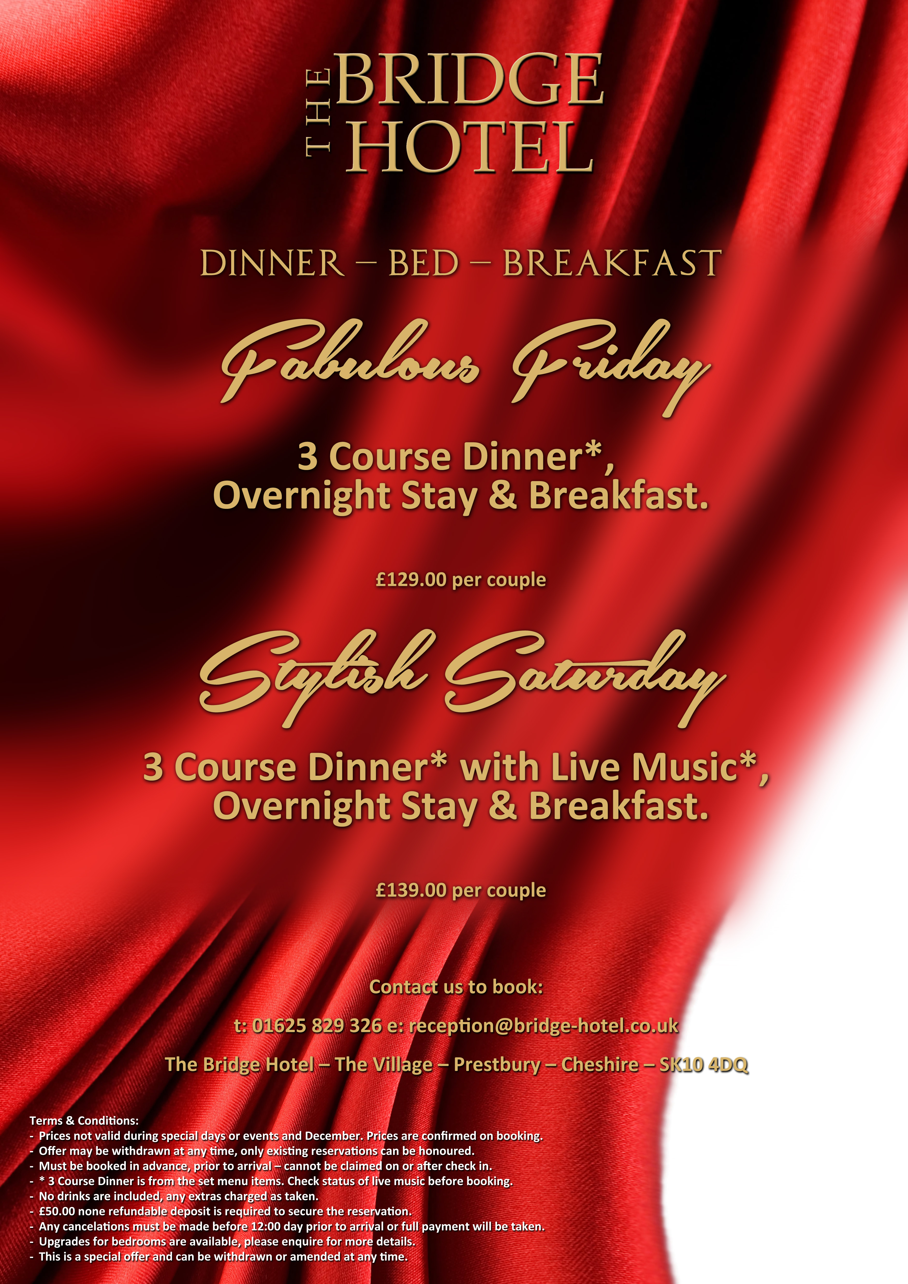 The Bridge Hotel, Prestbury, Cheshire SK10 4DQ T: +44 01625 829326 e: [email protected]